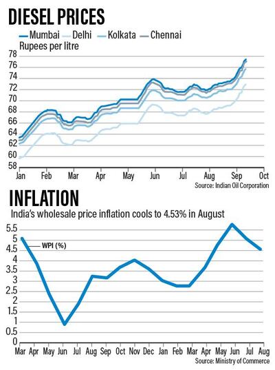 “For my business and other transporters' business, fuel is one of our main inputs,” says Anil Vijan, the general secretary of the Bombay Goods Transport Association, an industry body in Mumbai. “It's a very sensitive issue. The transporters are very unhappy about this situation. "Unfortunately it comes at a time when demand for diesel picks up in India, with the festive season starting. We do blame the central government as well as the state government because of the high taxes.”