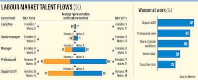 Looking at the UAE's energy industry as a whole, women make up 20 per cent of the support and lower professional levels, a figure that drops to 7 to 8 per cent at managerial level, according to the 2020 compensation report from global consultancy Mercer.