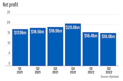 Net profit at Google's parent company dropped to about $16 billion in the three months to the end of June, more than $2.5bn less than the same period in 2021. Net profit on a quarterly basis fell about 2.6 per cent.