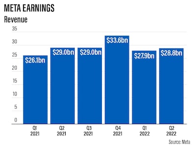 Meta’s capital expenditure, including principal payments on finance leases, in the second quarter was nearly $7.8bn. It is expected to be in the range of $30bn to $34bn for the 2022 full financial year.