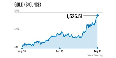 The spot gold price rose as high as $1,526.95 per troy ounce at 3.05pm in the UAE on Tuesday, reaching a record since April 2013. Spot gold is up 19 per cent this year-to-date