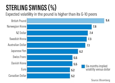Three-month implied sterling-dollar volatility touched 8.72 per cent Wednesday while the six-month gauge hit 9.49 per cent, both the highest since April. By contrast JPMorgan's Global FX Volatility Index is hovering near record lows.