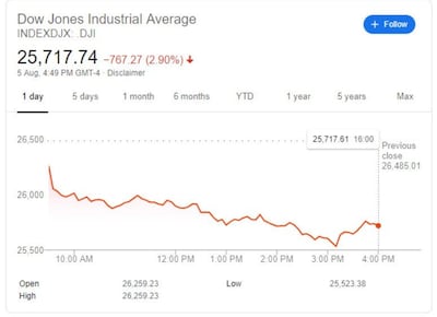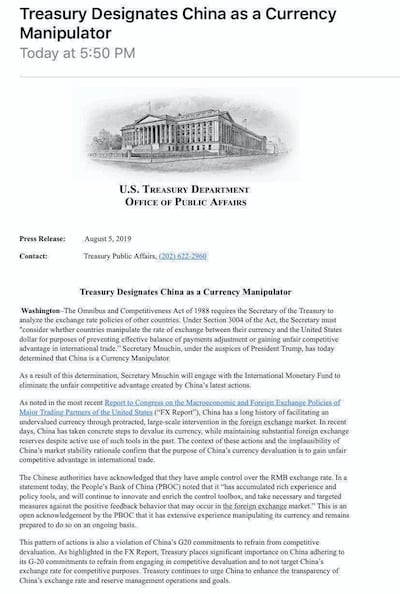 US President Donald Trump's announcement to slap 10 per cent of additional tariffs on $300 billion (Dh1.1 trillion) of Chinese imports in September and the subsequent decision by Beijing to let the yuan depreciate past the 7 yuan mark against the dollar (its lowest level in 10 years) prompted the US Treasury to designate China as a currency manipulator on Monday, jolting markets and wiping out billions of dollars.