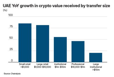 Small retail (less than $1,000) and large retail ($1,000 to $10,000) crypto transactions in the UAE each increased by more than 80 per cent. This is in contrast to most other countries globally.