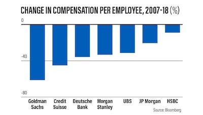 Compensation per employee is down by 61 per cent at the Wall Street firm when adjusted for nominal wage growth in the period, according to company filings and calculations by Bloomberg. Goldman had the sharpest pay decline among a dozen of the largest US and European banks, followed by Credit Suisse Group at 46 per cent. The group had an average reduction of 14 per cent.