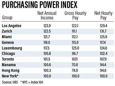 Los Angeles boasts the world’s best buying power for the average worker’s salary, with residents there able to afford almost a quarter more than New Yorkers. Zurich took second position, while Miami came in third.