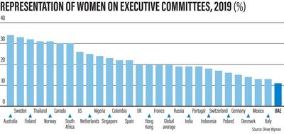 Australia leads the way with 38 per cent of executive committees made up of women, followed by Sweden at 33 per cent and Finland at 32 per cent. The UAE featured high on the list compared to other Gulf countries with a percentage of 11 per cent. The US has only 26 per cent female representation on executive committees, while the UK and Hong Kong have 20 per cent.