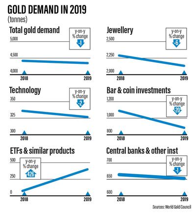 The precious metal's high prices, however, drove consumer jewellery and retail demand lower, with overall gold demand falling 1 per cent, from 4,401 tonnes in 2018 to 4,355.7 tonnes last year, according to the Gold Demand Trends report released on Thursday. ETFs grew 426 per cent from 76.2 to 401.1 tonnes at the end of last year.