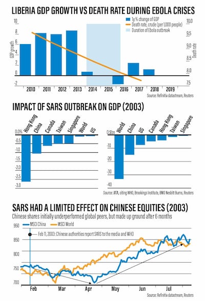 However, price action in markets indicates that the impacts of such outbreaks are limited. After Chinese authorities reported the outbreak of SARS to the WHO in 2003, the MSCI China index of shares decoupled from its global peers — but made up the lost ground in only six months.