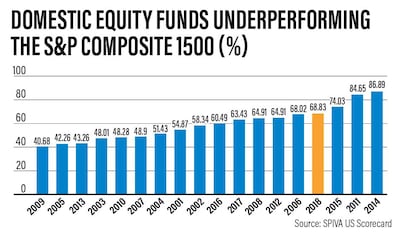 In the 15 years to December 29 2017, 92.33 per cent of actively managed large cap US funds failed to beat the S&P 500, according to the Spiva US Scorecard. The failure rate rose to 94.81 per cent for active funds covering the S&P Mid-Cap 400 Index, and 95.73 per cent for the S&P Small Cap 600 Index.