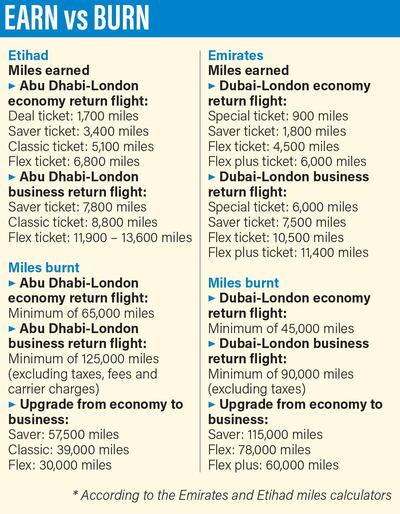 Emirates Skywards, which has been combined with flydubai's Open Rewards programme, has a global membership of 23 million, of which 1.6 million are in the UAE. A Dubai-London economy ticket earns between 900 miles on a special ticket and 6,000 miles on flex plus (these are not counting the tier miles that determine one's frequent flyer status). In business class, the same route earns between 6,000 miles for special and 11,400 for flex plus.
