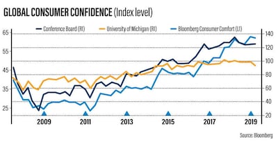 The American consumer has remained a pillar of growth in part because of the lowest unemployment rate in five decades. While the US labour market has shown signs of easing, it should continue to support household spending. Hiring sprees elsewhere have also helped and the Conference Board reported this week that its index of global consumer confidence remains near a record high.