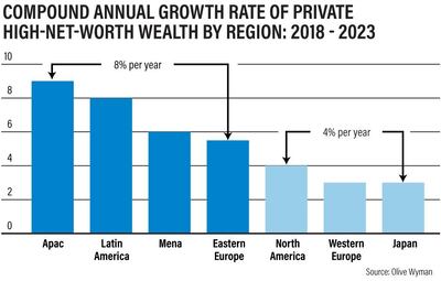 According to the Oliver Wyman and Deutsche Bank study, private high net worth wealth in the MEA region is expected to grow by 6 per cent annually until 2023, while Asia Pacific is expected to reach a high of 9 per cent over the same period and Latin America at 8 per cent, compared to rates of 4 per cent in North America and 3 per cent in Western Europe.