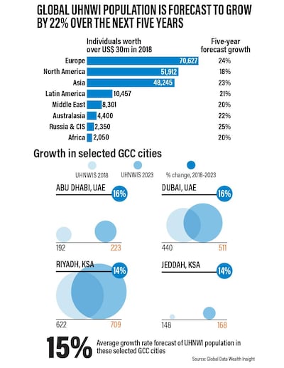 Ultra-high-net-worth individuals in the Middle East – people with a net worth of more than $30 million (Dh110.2m) – are projected to increase by 20 per cent in the next five years, according to a new report by global property consultancy Knight Frank. That means the region will add another 1,660 people to the upper band of the very wealthy by 2023.