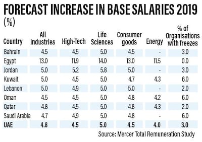 Another interesting figure applies to the energy industry, previously the highest paying sector in the UAE. It is expected to perform below the market in 2019 with an expected increase of 4 per cent next year. However, Mr Raffoul said the fact there are pay rises, even though they are lower than other industries, is still positive.