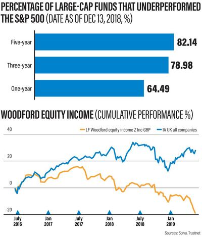 Over the year to December 31, 2018, 64 per cent of large cap funds underperformed the S&P 500, according to research from SPIVA. That figure rose to 79 per cent over three years and 82 per cent over five.