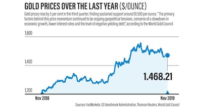 The price of gold and stock markets have seen record highs and the US dollar is strong. At the same time, the US Federal Reserve and European Central Bank (ECB) have been cutting interest rates, yields on $17 trillion (Dh62.4tn) of bonds have turned negative and global economic growth has slowed.