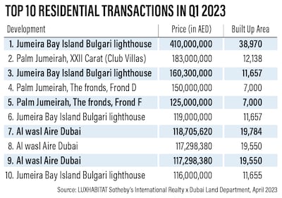 Meanwhile, 294 prime villas sold for Dh5.6 billion in the first quarter, with The Palm Jumeirah, Dubai Hills Estate and Al Barari emerging as the top three areas for the segment.