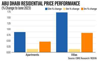 In Abu Dhabi's residential market, average apartment and villa prices in the second quarter registered year-on-year increases of 0.9 per cent and 1.7 per cent, respectively, CBRE said.