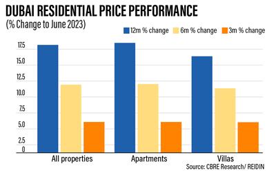 Average prices in Dubai's residential market increased by 16.9 per cent in the year to June, with apartment prices up 17.2 per cent and average villa prices rising by 15.1 per cent, CBRE said.
