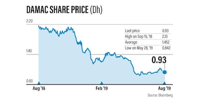 Damac's shares fell 2.92 per cent at mid-day on Thursday to 0.93 fils. The company's 52-week low share price is 0.842 fils.