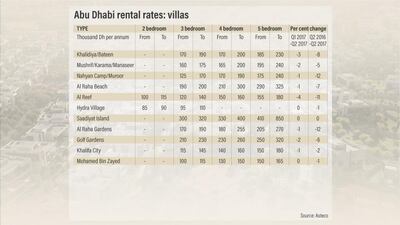 It said villa rents fell just 1 per cent on average and 5 per cent over the year. Drops were more noticeable among the mid-to-low quality products located in Abu Dhabi City and Al Reef.
