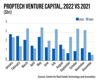 However, venture capital investments in PropTech companies have declined by 38 per cent to $19.8 billion this year, from a record-setting $32 billion in 2021, making 2022 the second-lowest investment year since 2018, according to data from the New York-based Centre for Real Estate Technology and Innovation.
