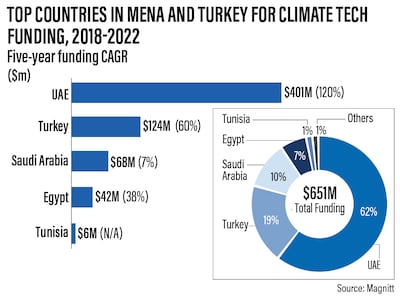 Funding for UAE climate tech start-ups grew at a compound annual growth rate of 120 per cent in the five-year period, which was double that of second-place Turkey's 60 per cent.