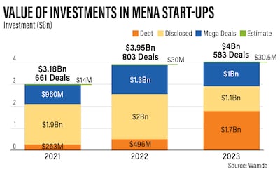 Overall, start-ups in the Mena region raised $4 billion in 2023, up 1.7 per cent annually, although half of the funding came from debt financing, the report said.