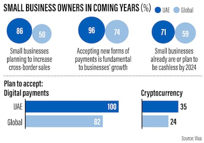 All small business owners surveyed in the UAE (82 per cent globally) said they plan to accept some form of digital payments in 2022, including crypto, with 35 per cent (24 per cent globally) indicating a willingness to accept currencies such as Bitcoin, the biggest cryptocurrency.