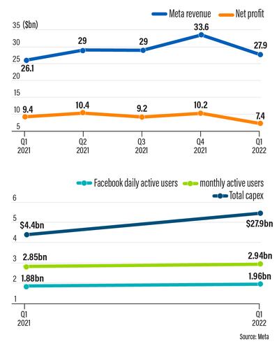 Facebook’s parent company Meta reported a 21 per cent year-on-year drop in first-quarter net profit, underpinned by a decrease in the average price per advertisement.