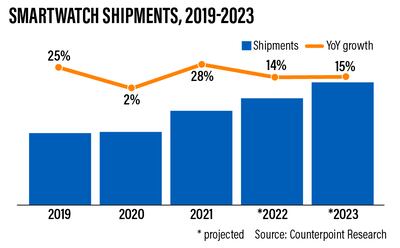 However, the expansion is expected to slow down this year. While smartwatch shipments surged 28 per cent in 2021 — a multifold increase from 2 per cent in 2020 — it is projected to halve to 14 per cent at the end of 2022 and then inch up to 15 per cent next year.