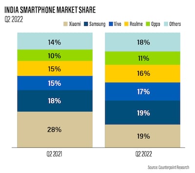 China's Xiaomi remained the market leader in terms of smartphone shipments in India, capturing a 19 per cent share of the market, followed by South Korean brand Samsung with a similar sized market share, and Chinese brand Vivo, which came in with a slice of 14 per cent, Counterpoint's data shows.