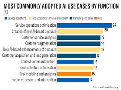 The creation of new AI-based products, which falls under product and service development, was second with 20 per cent, while customer service analytics, under marketing and sales, came in third with 19 per cent.