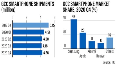 Samsung remained the market leader in the GCC, with a 42 per cent market share, followed by Apple (23 per cent), Xiaomi (11 per cent) and Huawei (8 per cent).