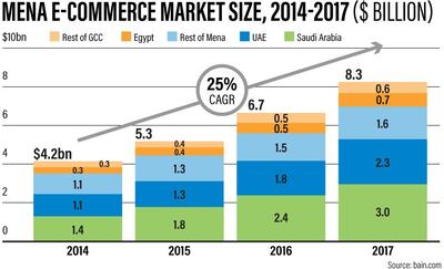 E-commerce has upended the traditional bricks-and-mortar retail model, with online shopping becoming a $2.2 trillion market, according to the consultancy Bain. Compared to other parts of the world e-commerce in the Arab world is at a nascent stage but growing. The Middle East and North Africa e-commerce marketplace reached $8.3bn in 2017 with an annual growth rate of about 25 per cent. The GCC and Egypt, which account for the majority of online sales, outpace the region’s overall growth rate expanding at 30 per cent a year and there is room for growth given that penetration is comparatively low compared to the rest of the world.