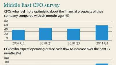 Some 67 per cent of chief financial officers surveyed in the Middle East and North Africa (Mena) region say they are decidedly optimistic about the financial prospects of their company now compared to the prior six months. That is up 21 points from when the question was first posed at the end of 2009 and marks an 18-month high, says a study from the consultancy Deloitte & Touche.
