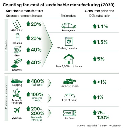 A car would cost 1.4 per cent more and a washing machine 1.5 per cent extra due to markups on plastics and steel, says the Industrial Transition Accelerator, an initiative set up at Cop28 in the UAE and backed by billionaire Mike Bloomberg. It is calling on governments to step in and push commercial buyers to go green.