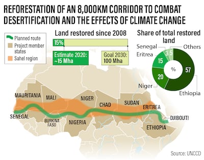 The Great Green Wall is focused on efforts to restore 100 million hectares of desert south of the Sahara, including in Senegal in the west and Djibouti in the east. With a 2030 target for establishing the green footprint, the plans have changed from the original concept of a 7,000km wall of trees.