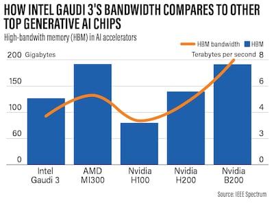 In terms of high-bandwidth memory, Gaudi 3 has more HBM than Nvidia's H100, but less than the H200, the latest B200 and AMD's MI300, according to data from IEEE Spectrum, the publication of the Institute of Electrical and Electronics Engineers.