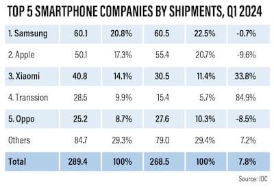Rounding out the top five is Oppo, another China-based brand, which counts OnePlus under its umbrella. Oppo saw its shipments decline 8.5 per cent to 25.2 million units in the first quarter, and its market share down to 8.7 per cent.