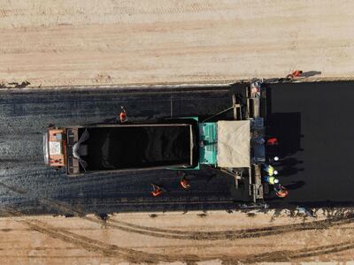 Workers pave part of the new road that will run from central Iraq to Saudi Arabia.