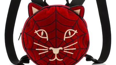 The spider’s web is a recurring motif in Dellal’s designs. “I was inspired by my namesake in [E B White’s novel] Charlotte’s Web,” says the husky-voiced designer with a laugh. Now all Charlotte Olympia shoes are stamped with a gold or black web on the heel or insole. "You can afford to be a bit more playful with shoes, I think.” A cheeky feline is another favourite motif, and for the new collection, Dellal has merged the two tropes. The children’s backpack and Cool Cat slip-ons, for instance, are made from velvet dyed in Spider-Man red and come embroidered with a web, but the face peering out is that of the signature Charlotte Olympia Kitty.