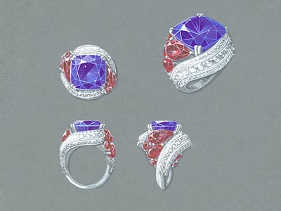 David Morris, which made the bespoke dragon statue that adorns the bonnet of the Aston Martin that Queen Elizabeth gave to King Charles on his 21st birthday in 1969, has designed a second unique piece — a ring based on the colours of the Union Jack flag, with a central 17.5-carat rare purplish-blue spinel, a red-pink spinel and white diamonds.