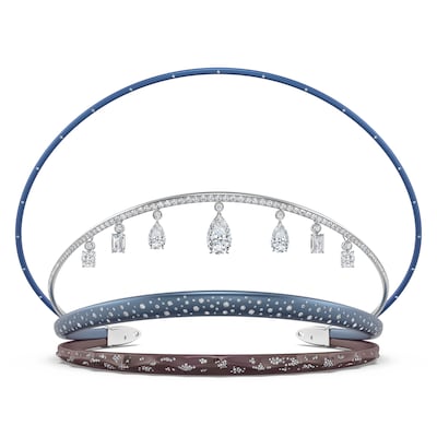 Heirloom tiaras are currently being polished up for the occasion, while London’s jewellers have been busy creating glorious new pieces. De Beers, David Morris and Yoko London have all crafted one-of-a-kind creations to mark the coronation. The De Beers design is particularly contemporary and daring, featuring three arcs in blue titanium and platinum, each speckled with diamonds, while pear and baguette-shaped diamond drops are suspended on a fourth arc.