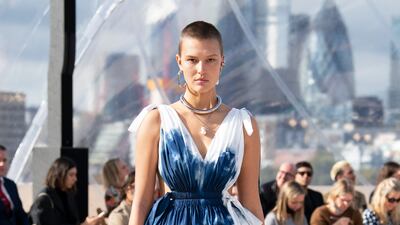 A tank dress was covered in shards of blue crystal to mimic sheets of rain, while elsewhere, crystal embroidery cascaded over the shoulders of a double-breasted jacket in grey wool. Supermodel Naomi Campbell, seemingly making as many runway appearances at the age of 51 as she did in her 1990s heyday, closed the show in a skeletal corset dress and single-breasted jacket with crystal embroidery.