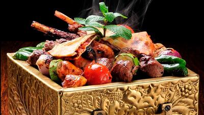 The family meal consists of an assortment of meats such as kebabs, koftas, veal cutlets, lamb chops, chicken breast and shish tawook, alongside a selection of fresh grilled vegetables and halaby bread.