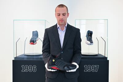“Each of these sneakers was worn by Michael Jordan in the six games that the Chicago Bulls won the championships in,” Eric Hirsch, Sotheby’s sports memorabilia specialist tells The National.