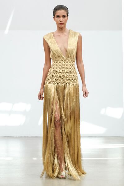 Elsewhere, a crisp patterning of blue lines traced from a halterneck fell to the floor, in geometric contrast to the flowing, plisse skirt, while two looks seemed to be woven from an intricate matrix of golden threads, echoing traditional Aghabani embroidery. This plaiting was also used to create a corset that floated over a gossamer chiffon gown.