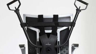 This nifty contraption has resistance straps that fit snugly on to the backrest of an office chair. The two elongated arms stretch out and can be used for bicep curls, rowing, shoulder presses and abdominal crunches. The resistance exercises also help relieve upper-back tension and stiffness from prolonged sitting.